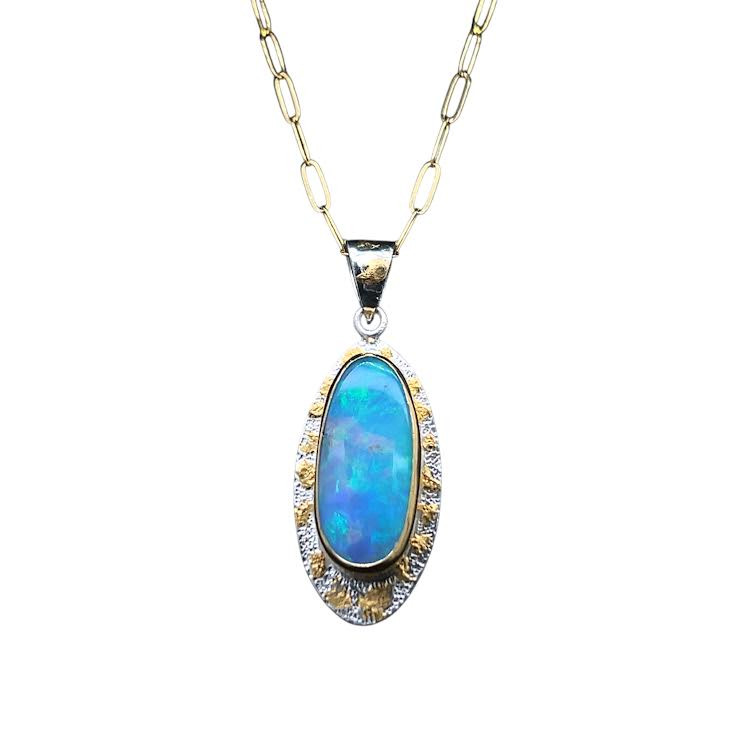 Welo Opal Pendant and 22k Gold. I cut this very bright and gemmy opal from a parcel of Ethiopian opal. Has multi-flashes of all the colors of the sky with blue, green, orange, red and yellow. This opal is exceptionally large and gemmy throughout. Set in a 22K gold bezel with 22K gold accents. Base layer is textured sterling silver and comes with an 18 inch 14K gold filled chain.