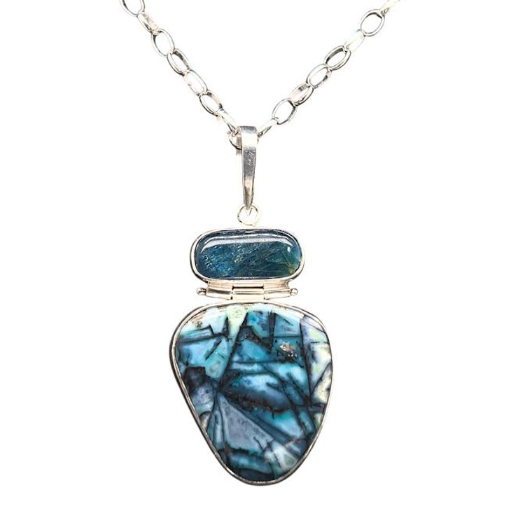 I cut this real uniquely patterned Indonesian gemstone to accentuate the needles of copper chrysocolla within the quartz matrix. It almost looks like a modern painting. There is a small reflective crystal of copper on the surface which is special. I cut the apatite accent stone from a sample from Madagascar. Set in fine silver bezels with sterling silver custom bail, hinges, and 18” chain included.
