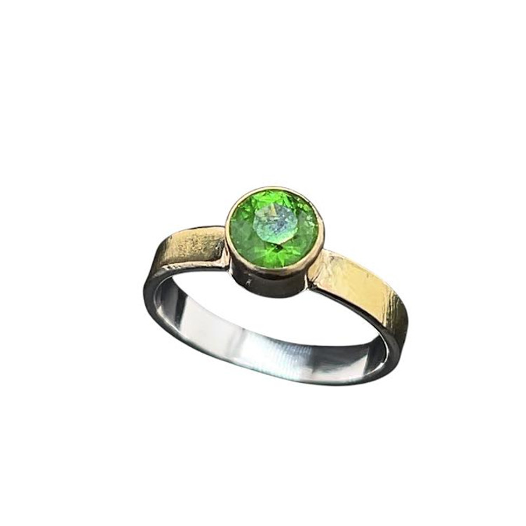 Tsavorite Garnet Ring in Gold & Silver. I faceted this deep emerald green garnet from Tanzania in one of my favorite designs called ‘Classic’ with 58 facets. These garnets are rare in sizes over a carat and this stone measures at 1.06 carats. The color is intense and vibrant and is set in 18K gold bezel with 14K Gold textured band over silver. The band texture has been lasered in with a custom pattern I designed and comes in a size 7.